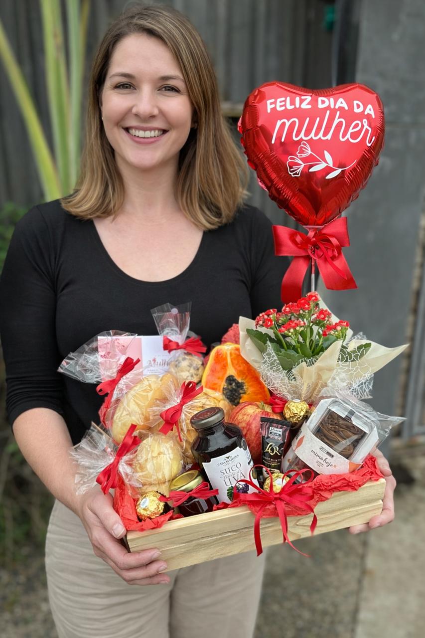 Este cesto contém: flor plantada, balão 20cm personalizado, bolinho caseiro, suco integral, Ferrero Rocher, geleia de morango, café solúvel, pão de queijo, pãozinho, torradinha salgada, cookies, mamão e maçã.