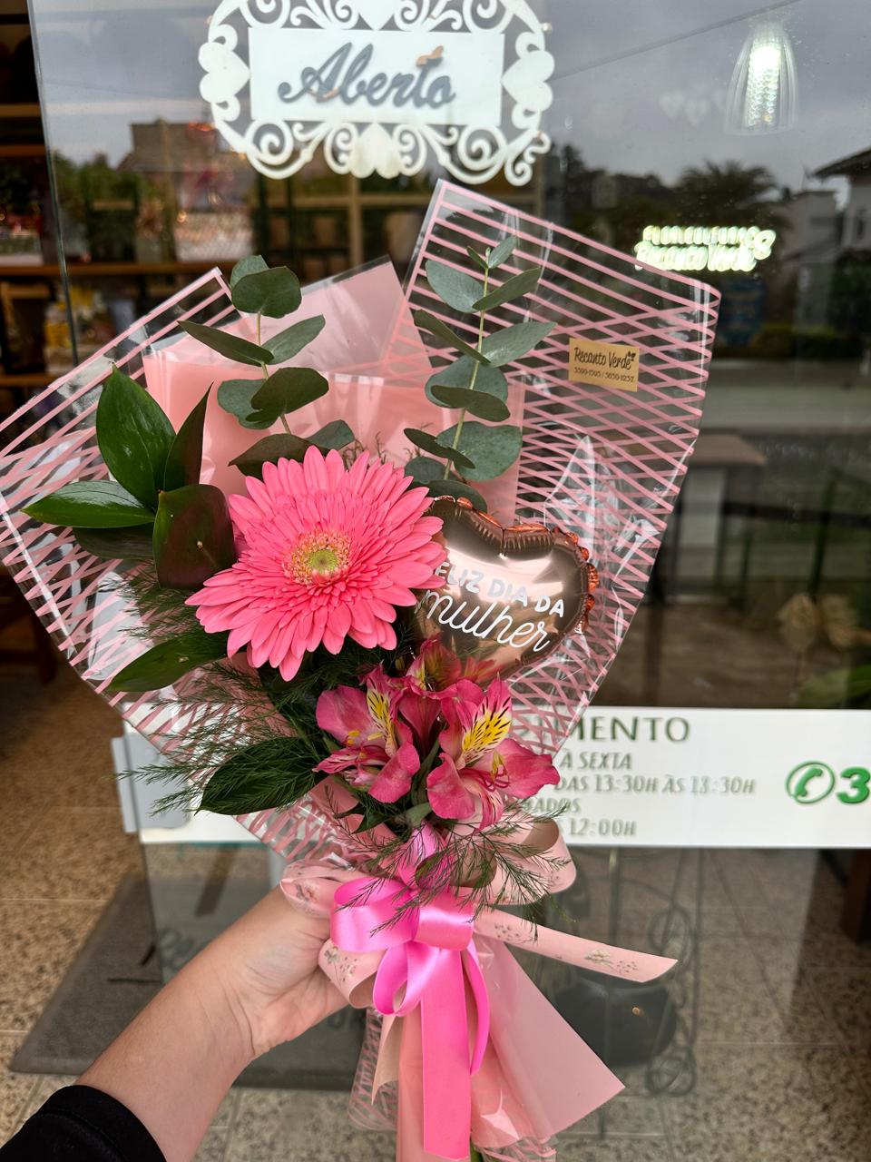 Ramalhete com gérbera decorada + balão 15cm personalizado