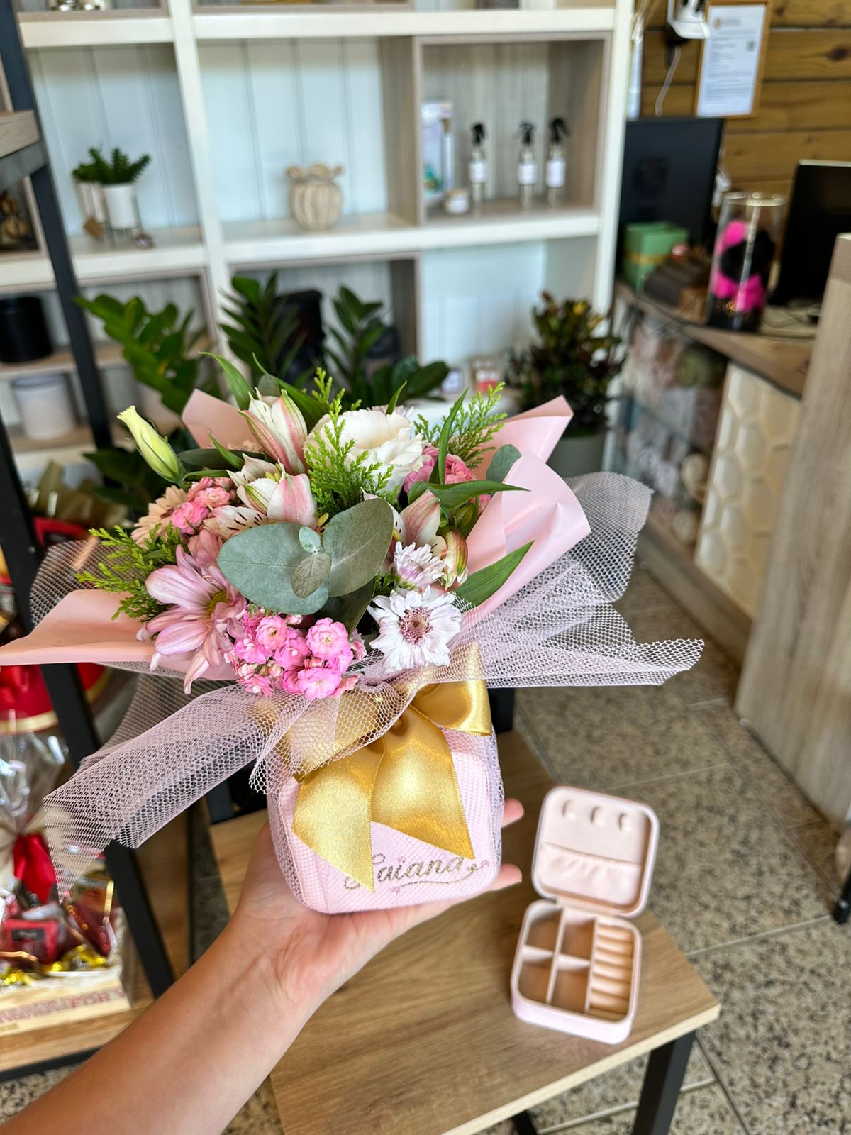 Porta joias personalizado + arranjo de flores mistas naturais
