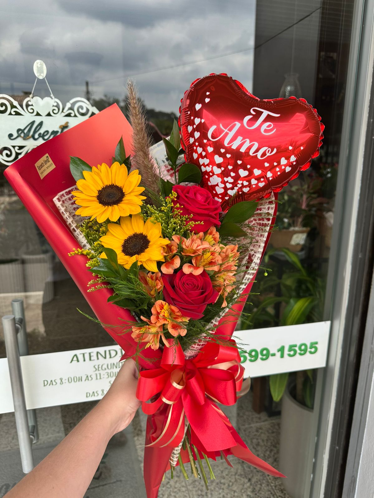 Ramalhete com 2 rosas vermelhas + 2 girassóis + balão 20cm personalizado